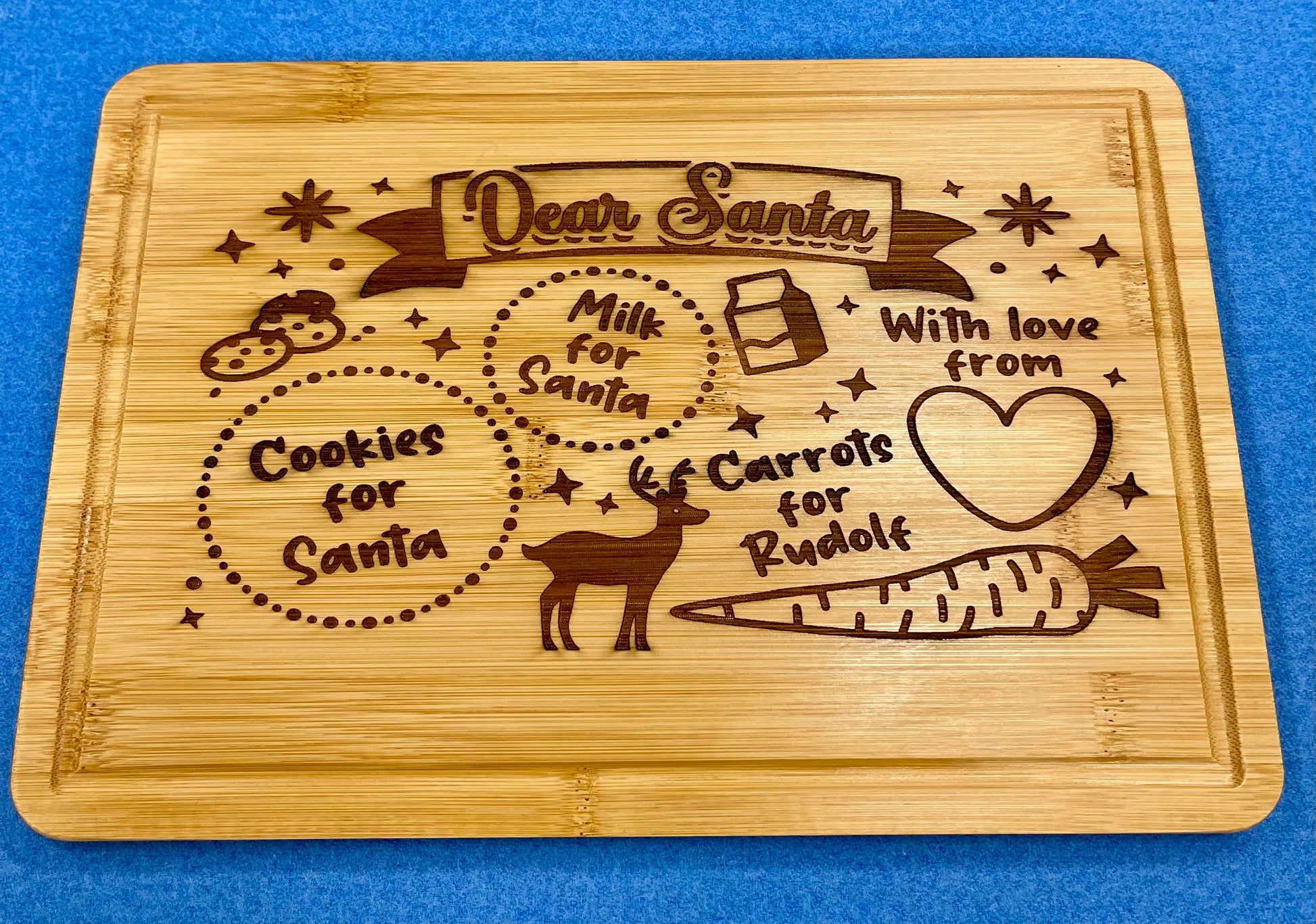 This laser engraved tray is the perfect accessory to make Santa's visit special. Featuring precision engraving onto a bamboo cutting board, this tray provides a classic and timeless look. Enjoy a solid foundation for Santa's cookies and milk with a tray that's guaranteed to last for years to come. Customize it with your child's name, or the family name!